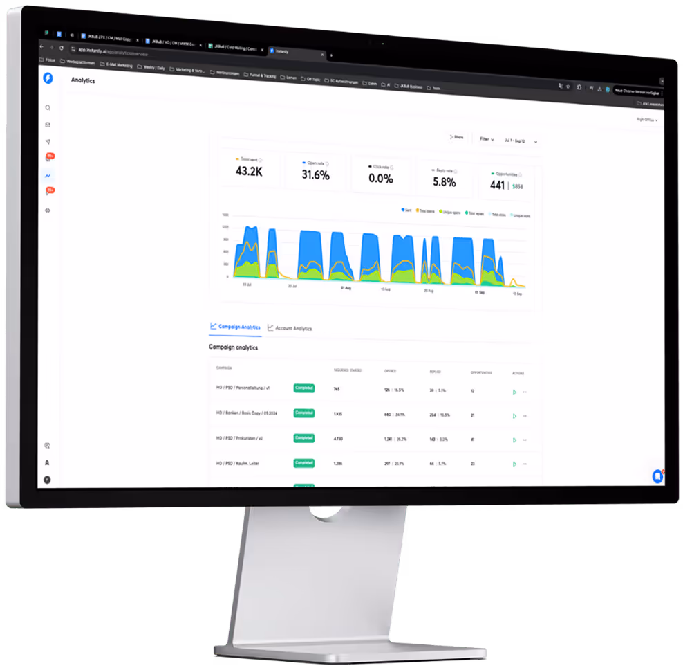 Mit Tools wie Instantly erreichen wir die Entscheider-Persönlichkeiten, potenzieller Kunden und sorgen mit überzeugenden Copys dafür, dass sie sich mit Interesse an einer unserer Dienstleistungen zurückmelden.